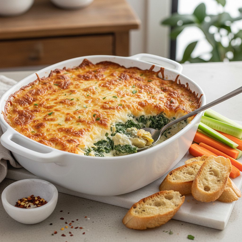 Le dip d’épinards et artichauts est une préparation crémeuse et savoureuse, emblématique des apéritifs nord-américains, mais adoptée dans le monde entier pour sa convivialité et sa richesse en saveurs. Ce mélange chaud d’épinards fondants, de cœurs d’artichauts tendres et de fromages gratinés offre un équilibre entre douceur végétale et onctuosité. Il se distingue par sa texture filante et son goût réconfortant, tout en restant accessible et personnalisable (version allégée possible). Traditionnellement servi avec des pains grillés ou des crudités, il s’adapte à tous les contextes festifs. L’origine du dip remonte aux années 1950-60 aux États-Unis, où il est devenu un classique des buffets et des réunions familiales.