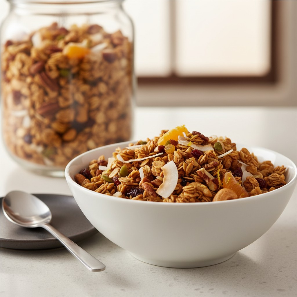 Ce granola maison marie la fraîcheur acidulée de la clémentine à la douceur exotique de la noix de coco, pour un petit-déjeuner ou un en-cas équilibré, croustillant et parfumé. Inspiré des traditions anglo-saxonnes du granola, ce mélange est revisité ici avec des agrumes de saison et des ingrédients naturels, sans excès de sucre ni additifs inutiles. La recette met l’accent sur la maîtrise de la cuisson pour obtenir un granola doré, non brûlé, et sur l’équilibre nutritionnel : fibres, bons lipides, sucres naturels et protéines végétales. Accessible à tous, elle permet de personnaliser les ingrédients selon les goûts ou les contraintes alimentaires, tout en garantissant un résultat savoureux et sain.