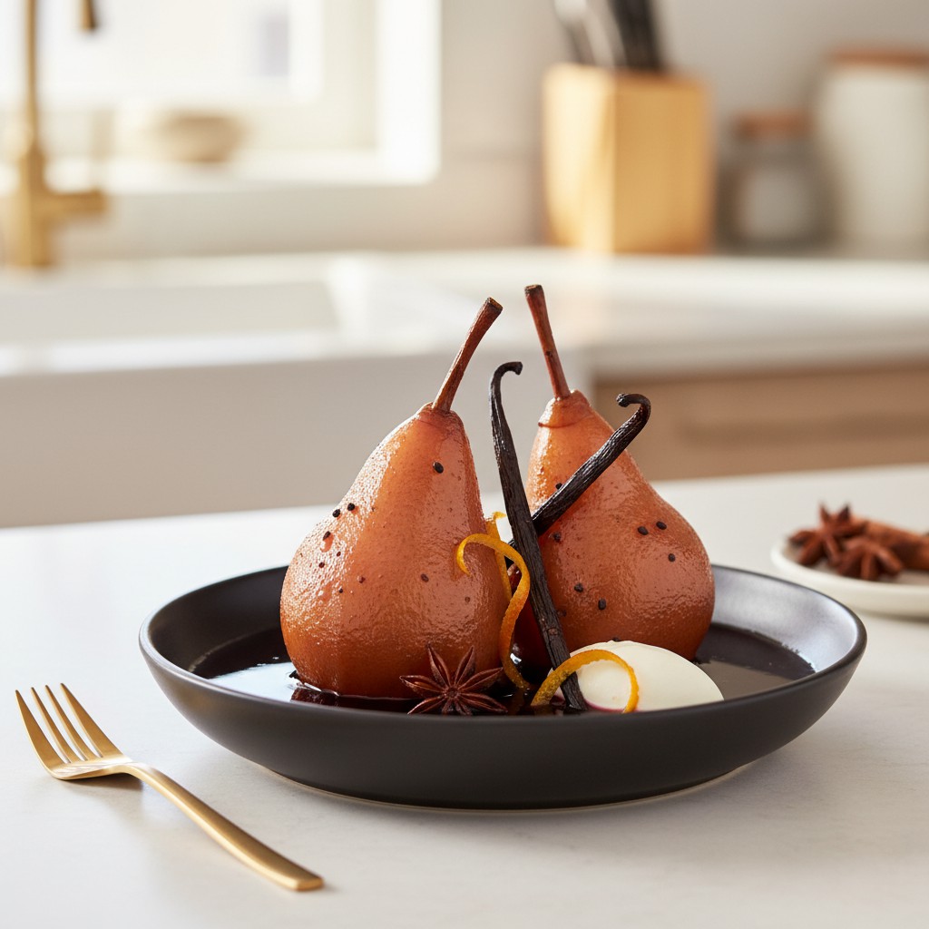 - Retirer délicatement les poires et réserver. Filtrer le sirop pour ôter les épices et les zestes. Remettre sur feu moyen et faire réduire 10 à 15 minutes jusqu’à obtenir une consistance sirupeuse et nappante. Goûter et ajuster le sucre ou ajouter un trait de miel si besoin.