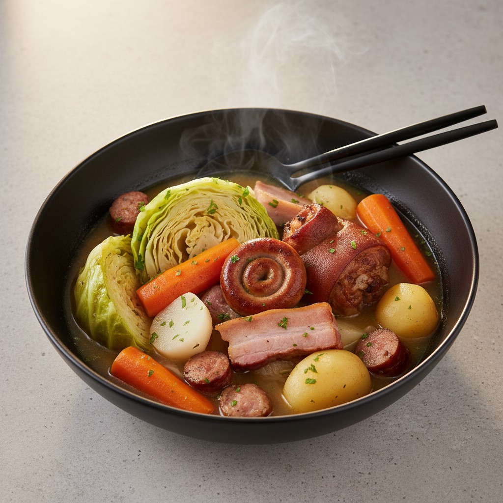 La potée auvergnate est un plat emblématique du Massif central, symbole de la cuisine paysanne française. Ce mijoté généreux associe des légumes rustiques (chou, carottes, navets, pommes de terre) à des viandes de porc (palette, jarret, saucisse), pour un résultat à la fois réconfortant, équilibré et savoureux. La cuisson lente permet d’obtenir des textures fondantes et un bouillon parfumé, idéal pour les grandes tablées d’hiver. Traditionnellement, la potée se partage en deux temps : d’abord le bouillon et les légumes, puis les viandes. C’est une recette authentique, accessible et nourrissante, qui valorise la simplicité et la convivialité.
