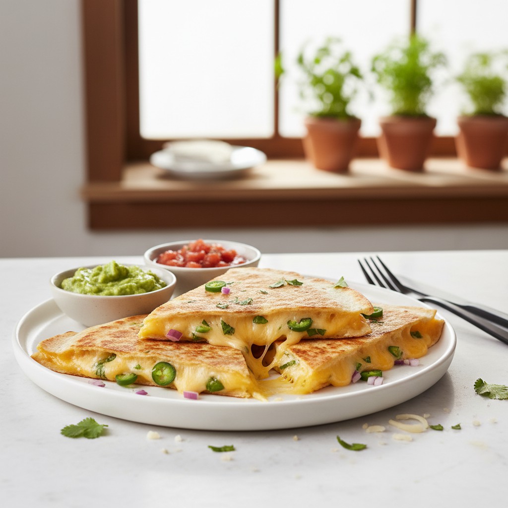 Les quesadillas au fromage sont un classique de la cuisine mexicaine, appréciées pour leur simplicité, leur goût réconfortant et leur rapidité d’exécution. Composées de tortillas de blé ou de maïs garnies de fromage fondant, elles se dégustent aussi bien en apéritif qu’en plat principal, accompagnées de salsa ou de guacamole. Cette recette met l’accent sur la maîtrise de la cuisson pour obtenir une texture croustillante à l’extérieur et un fromage parfaitement filant à l’intérieur. Les quesadillas sont nées de la tradition culinaire mexicaine, où elles étaient initialement cuites sur un comal (plaque en fonte). Elles illustrent l’art d’assembler des ingrédients simples pour un résultat savoureux et convivial.