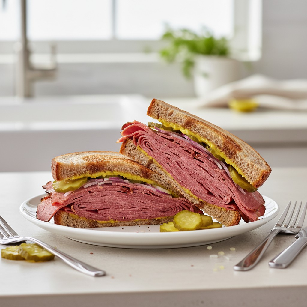 Le sandwich au pastrami est un classique de la cuisine new-yorkaise, né dans les communautés juives d’Europe de l’Est immigrées aux États-Unis. Il se distingue par la générosité de sa garniture : fines tranches de pastrami fumé, pain de seigle légèrement toasté, moutarde piquante et parfois quelques pickles. Ce sandwich allie textures (moelleux, croustillant, fondant) et saveurs franches, tout en restant simple à réaliser à la maison. Il offre un équilibre intéressant entre protéines, glucides complexes et fibres, surtout si l’on choisit un pain de qualité et des accompagnements végétaux. Idéal pour un déjeuner nourrissant, il peut être adapté selon les préférences (pain complet, moutarde douce, ajout de crudités).