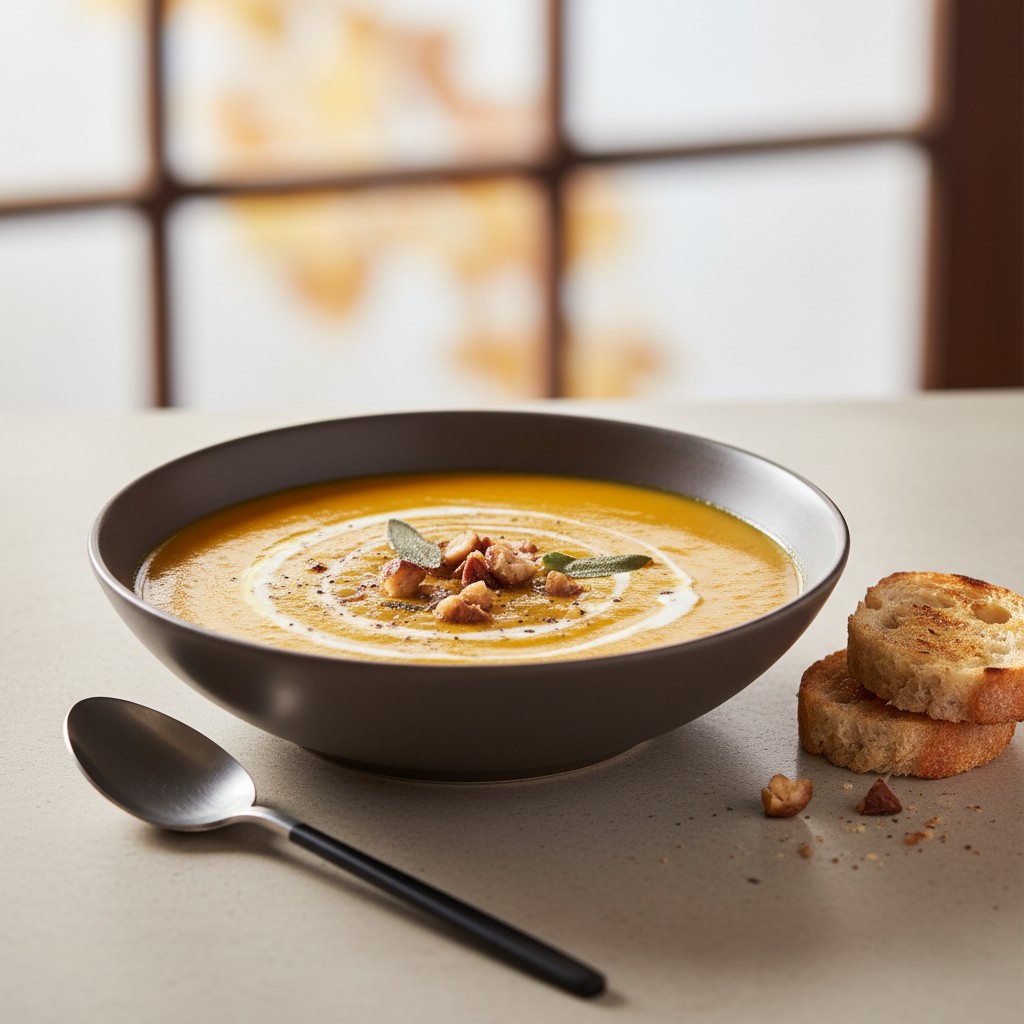- Servez bien chaud, éventuellement avec une cuillerée de crème fraîche ou de yaourt nature, et quelques brisures de châtaignes ou graines torréfiées pour le contraste de texture. Accompagnez de pain de campagne grillé.