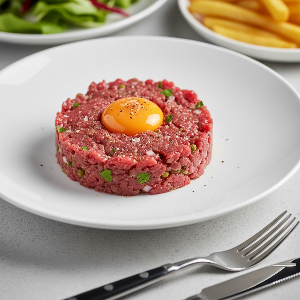 - Dressez le tartare dans des cercles ou à l’aide d’un emporte-pièce sur les assiettes. Creusez légèrement le centre et déposez un jaune d’œuf par portion. Servez immédiatement, accompagné de frites maison ou d’une salade verte croquante.