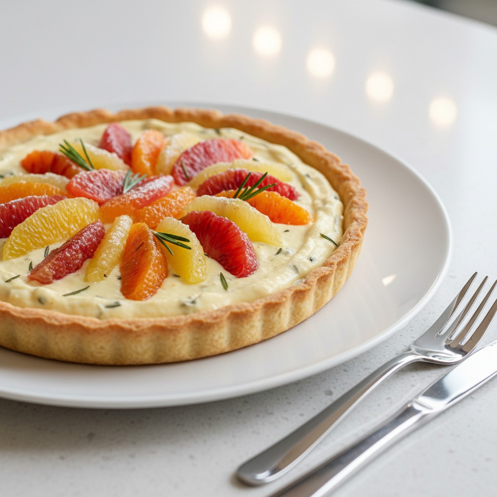 La tarte aux agrumes et romarin marie la fraîcheur acidulée des agrumes (orange, pamplemousse, citron) à la subtilité aromatique du romarin. Cette association, inspirée de la pâtisserie méditerranéenne, offre un équilibre entre douceur, vivacité et notes herbacées. La pâte sablée, croustillante et peu sucrée, accueille une crème d’agrumes onctueuse, relevée d’un sirop infusé au romarin. Cette recette met en avant la saisonnalité des fruits, la simplicité des ingrédients et la maîtrise des textures. Elle est idéale pour un dessert raffiné, digeste et original, sans excès de sucre ni de matières grasses superflues.