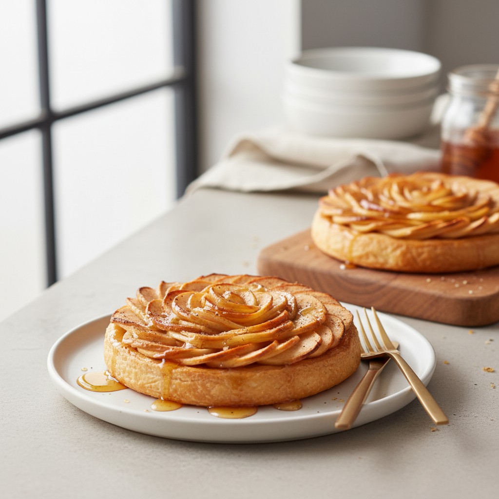 - Disposez les tranches de pommes en rosace, en les faisant se chevaucher harmonieusement, sans trop charger (la pâte doit rester visible sur les bords pour un croustillant optimal). Saupoudrez d’un peu de sucre blond si désiré, puis nappez chaque tarte d’un filet de miel (environ 1/2 c. à soupe par tarte). Ajoutez quelques noisettes de beurre sur les pommes pour une finition brillante et fondante (optionnel).