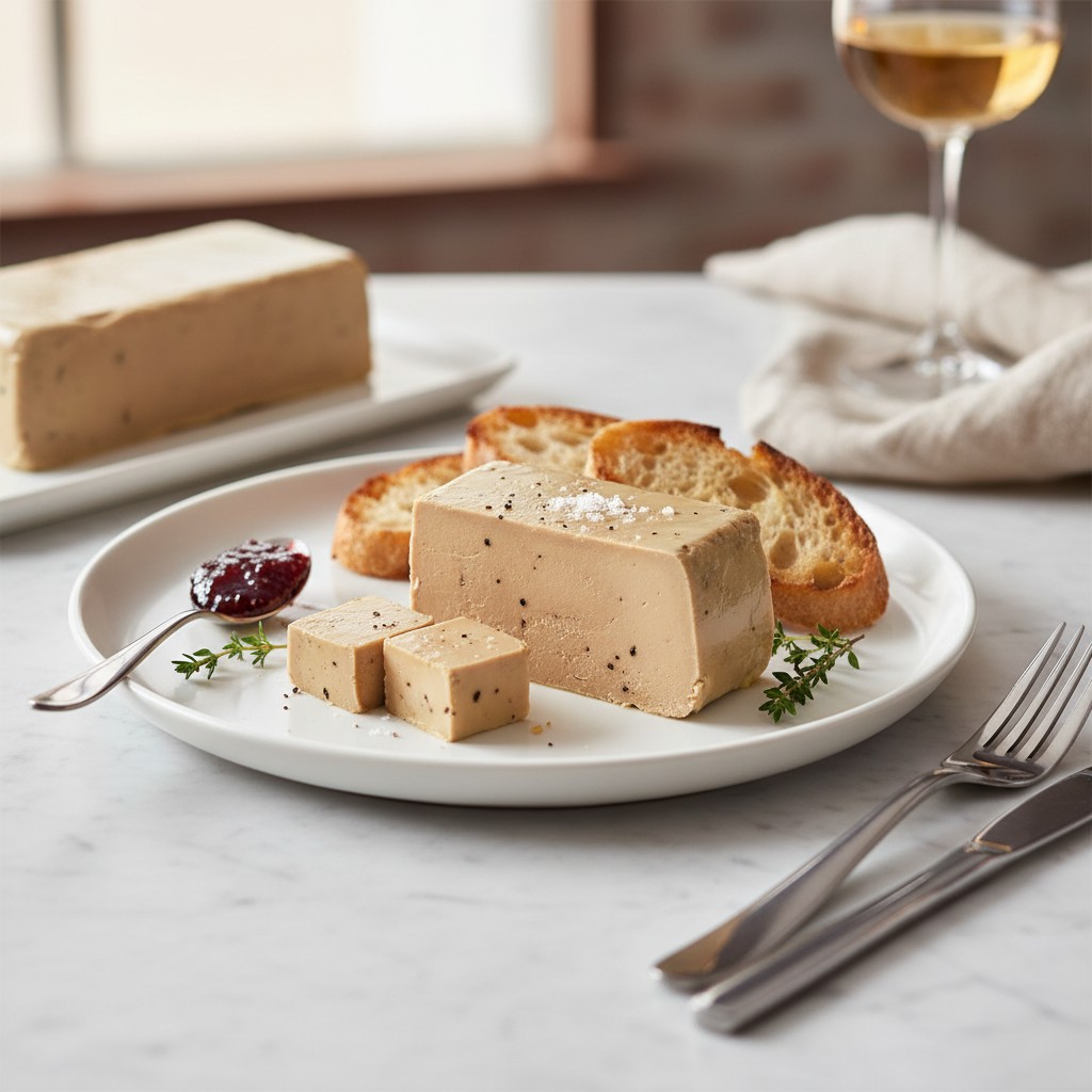 - Démoulez délicatement la terrine. Servez en tranches épaisses, accompagnées de fleur de sel, de pain de campagne légèrement grillé et, selon la tradition, d’un confit d’oignons ou de figues. Sortez la terrine 15 minutes avant dégustation pour révéler tous les arômes.