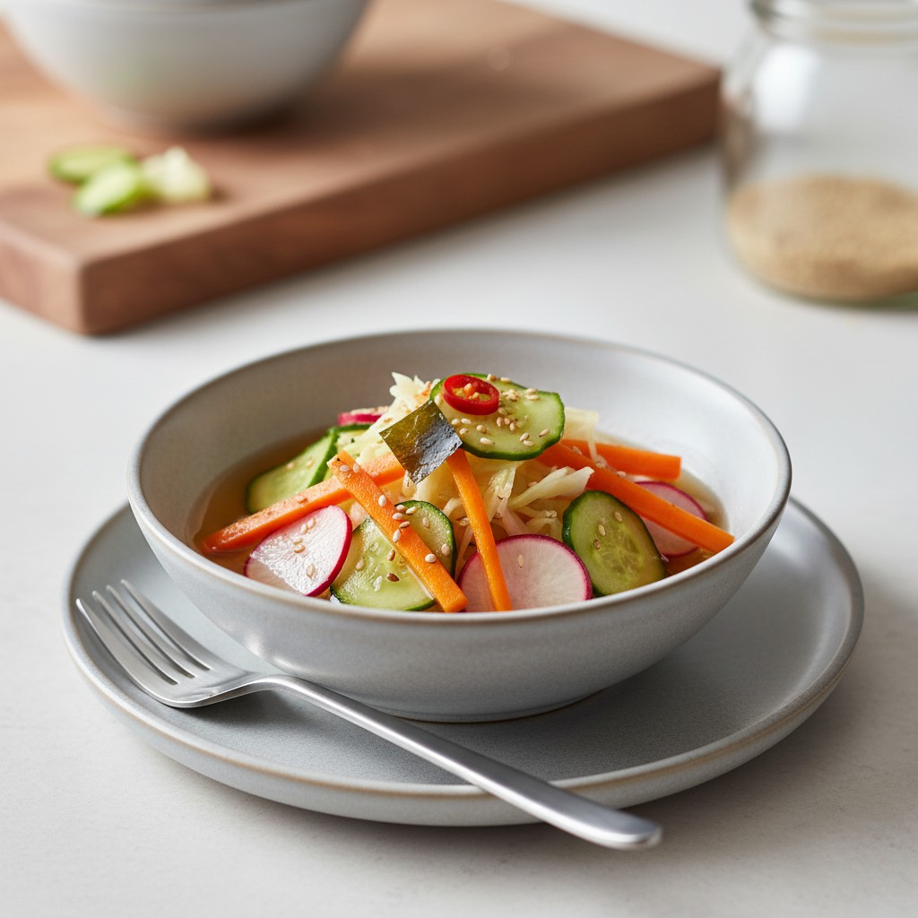 Le tsukemono désigne l’art japonais du légume mariné, une tradition millénaire qui sublime la fraîcheur des légumes par la fermentation ou la macération dans une saumure douce. Cette recette propose une version accessible, rapide et équilibrée, idéale pour accompagner riz, poissons ou plats végétariens. Les tsukemono apportent croquant, acidité subtile et une touche umami, tout en favorisant la digestion grâce à leur richesse en fibres et en probiotiques naturels. Leur simplicité cache une vraie technicité : l’équilibre du sel, la découpe précise et le respect des temps de repos sont essentiels pour obtenir des légumes à la fois savoureux, sains et authentiques.