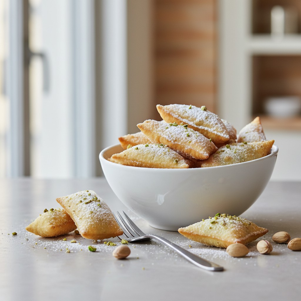 - Saupoudrez généreusement de sucre glace dès la sortie de l’huile. Parsemez éventuellement de pistaches concassées pour renforcer la note pistachée. Dégustez tiède ou à température ambiante.