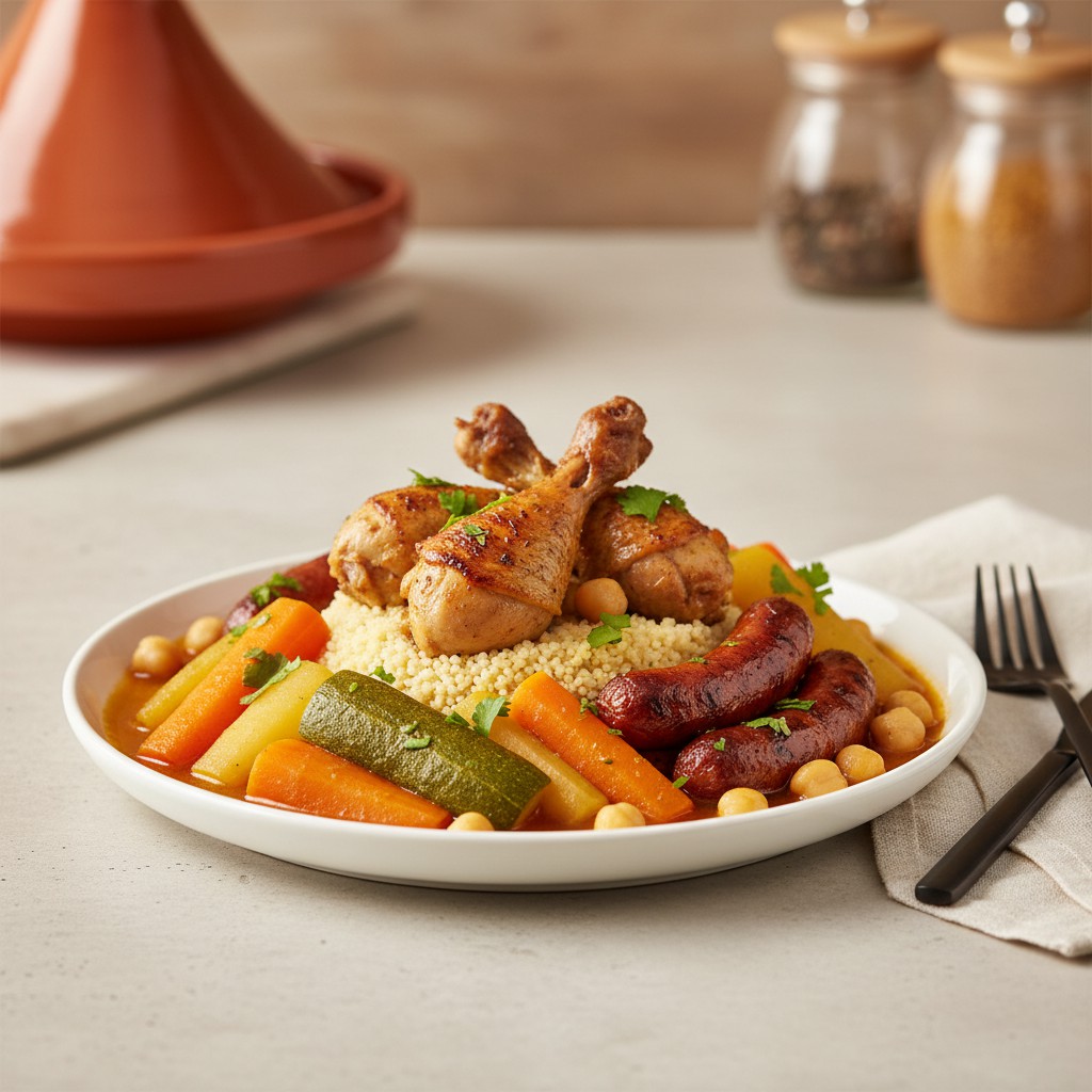 Le couscous poulet merguez est un plat emblématique du Maghreb, convivial et généreux, qui marie semoule légère, légumes fondants, poulet doré et merguez épicées. Cette recette, héritée des traditions berbères et adaptée au fil des siècles, séduit par son équilibre entre protéines, fibres et épices douces. Elle offre une expérience gustative authentique, tout en restant accessible à réaliser à la maison. Les conseils de chef inclus vous permettront d’obtenir une semoule aérée, des viandes savoureuses et un bouillon parfumé, pour un couscous réussi dès la première fois.