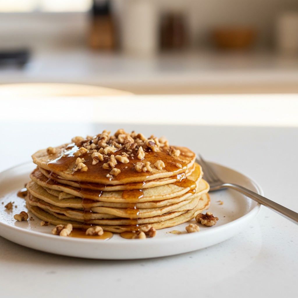 - Déposez les crêpes chaudes sur une assiette. Arrosez généreusement de sirop d’érable, parsemez de noix torréfiées. Servez immédiatement pour profiter du contraste chaud-froid et du croquant des noix.
