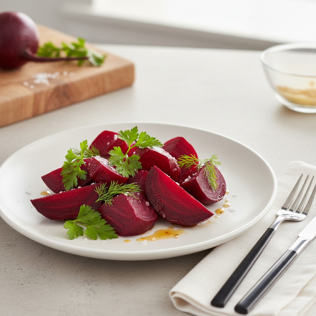 - Coupez les betteraves selon l’usage (dés, tranches, quartiers). Servez-les en salade, en carpaccio, ou intégrez-les à vos recettes préférées. Pour une saveur plus concentrée, vous pouvez aussi cuire les betteraves au four (en papillote, 180°C, 1h à 1h30 selon la taille).