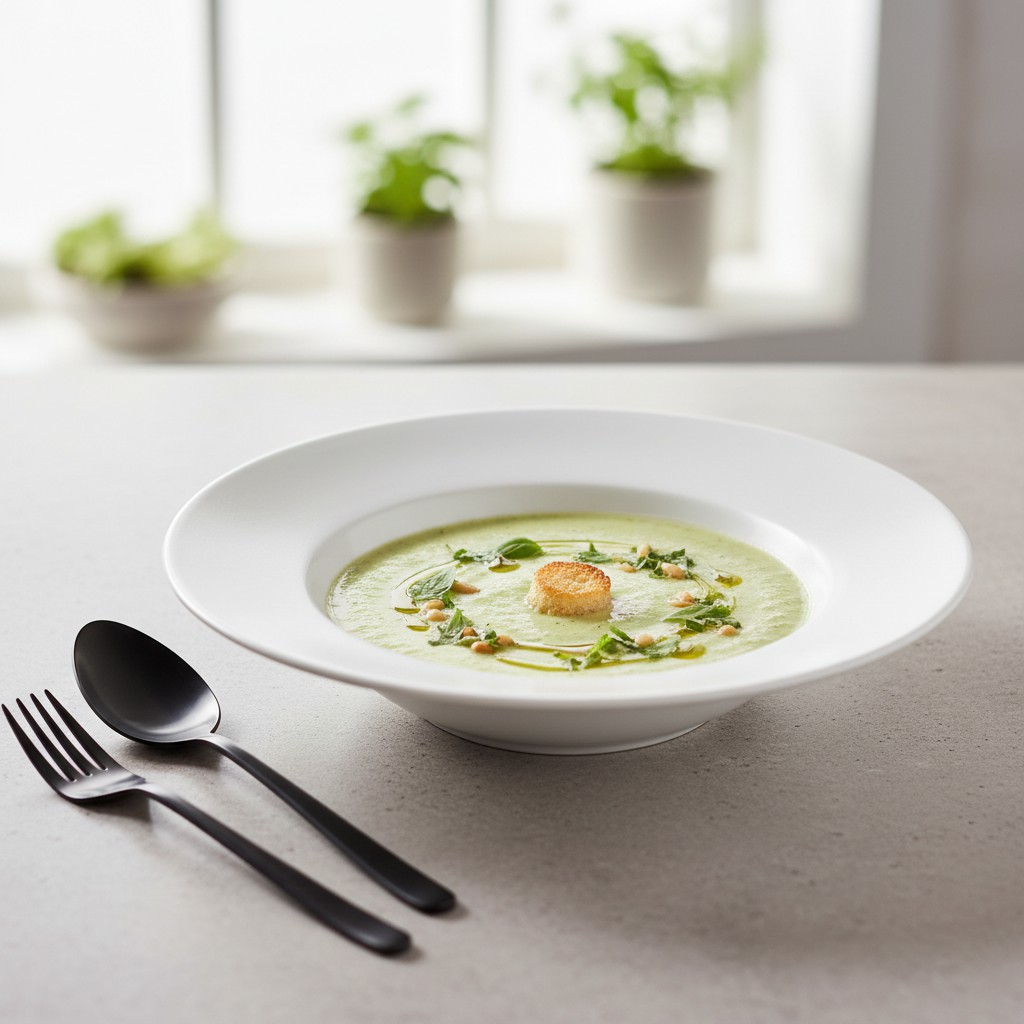 - Servez très frais, décoré de quelques gouttes d’huile d’olive, de feuilles de basilic ciselées et, éventuellement, de petits croûtons ou de graines torréfiées pour le contraste de texture.