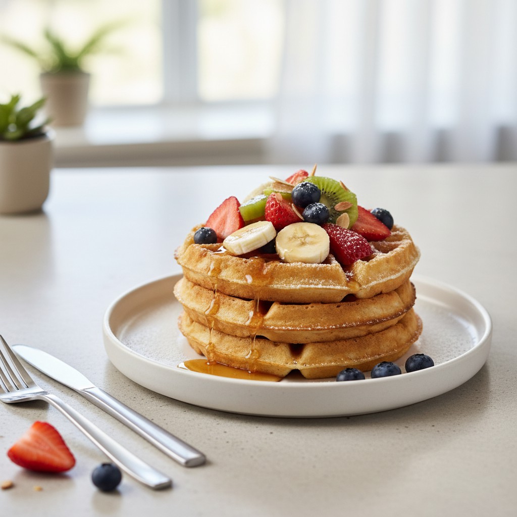 - Servez les gaufres tièdes, garnies généreusement de fruits frais. Pour plus de gourmandise, ajoutez un filet de sirop d’érable, un peu de yaourt végétal ou quelques éclats d’amandes grillées.