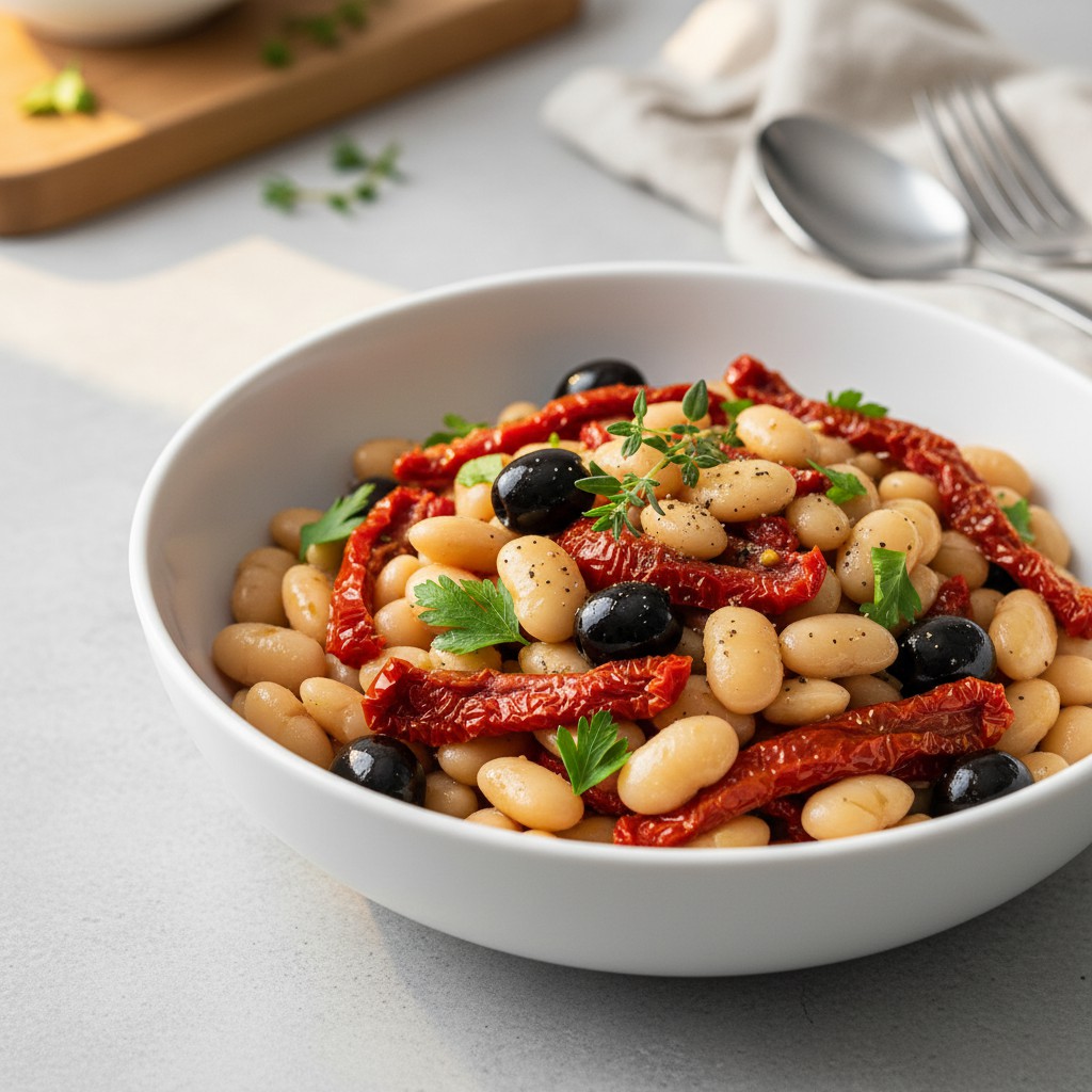 Plat d’inspiration méditerranéenne, les haricots blancs aux tomates séchées et olives marient la douceur des légumineuses à la puissance aromatique des tomates confites et des olives noires. Cette recette, à la fois nourrissante et équilibrée, met en valeur des ingrédients simples et accessibles, tout en offrant une belle richesse gustative. Traditionnellement, les haricots blancs sont un pilier de la cuisine du sud de la France et d’Italie, souvent associés à l’huile d’olive, aux herbes et aux légumes du soleil. Ici, la recette se distingue par sa facilité d’exécution, son apport en fibres et protéines végétales, et sa capacité à s’adapter à différents régimes (végétarien, végan, sans gluten).