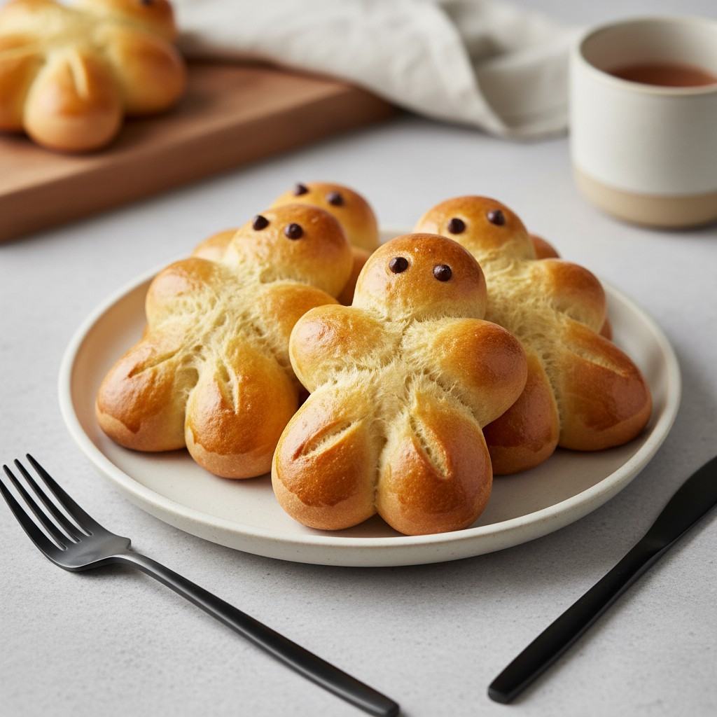 - Préchauffez le four à 180°C (chaleur tournante). Dorez les manalas au pinceau avec le jaune d’œuf battu avec une cuillère à soupe de lait. Ajoutez des raisins secs ou des pépites de chocolat pour les yeux si désiré.