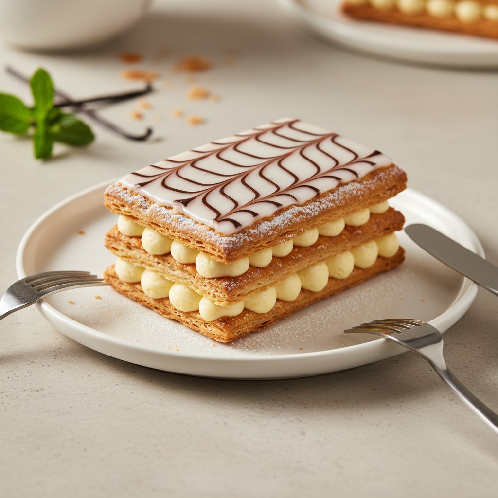 Le mille-feuille, aussi appelé « Napoléon », est un grand classique de la pâtisserie française, composé de trois couches de pâte feuilletée croustillante et de deux couches de crème pâtissière onctueuse à la vanille. Cette recette, emblématique des salons de thé parisiens depuis le XIXe siècle, séduit par le contraste de textures et la délicatesse de ses saveurs. Réaliser un mille-feuille maison, c’est s’initier à la maîtrise du feuilletage et de la crème, tout en découvrant l’importance du montage et de la découpe pour obtenir un résultat net et gourmand. Accessible avec un peu de méthode, il offre une expérience gustative authentique, loin des versions industrielles souvent trop sucrées ou molles. Astuce : la réussite du mille-feuille repose sur la cuisson parfaite de la pâte et la juste consistance de la crème. Cette recette propose des alternatives pour alléger la crème ou varier les parfums, tout en respectant l’équilibre nutritionnel.