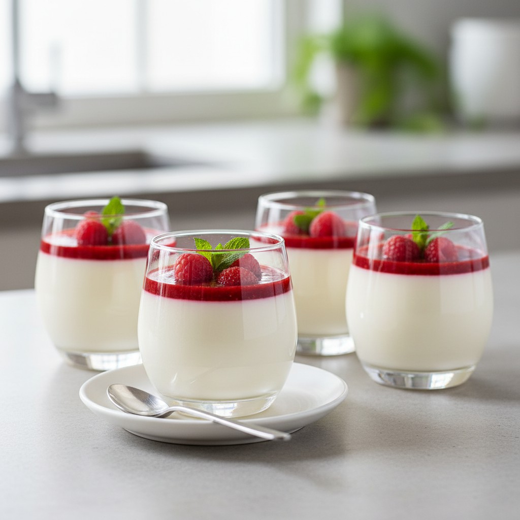 - 5. Versez la préparation dans des verrines ou des moules rincés à l’eau froide (cela facilite le démoulage). Laissez tiédir à température ambiante, puis placez au réfrigérateur au moins 4 heures pour que la pannacotta prenne.