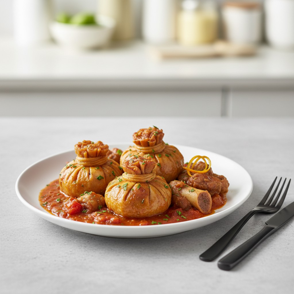 - Finition et service : Retirez délicatement les paquets et les pieds. Faites réduire la sauce si elle est trop liquide, rectifiez l’assaisonnement. Servez bien chaud, parsemé de persil frais, accompagné de pommes de terre vapeur ou de pain de campagne.