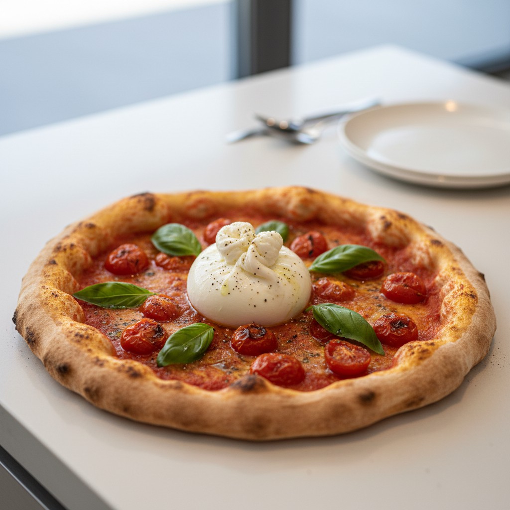 La pizza burrata est une variation contemporaine de la pizza italienne, mettant à l’honneur la burrata, ce fromage frais à cœur crémeux originaire des Pouilles. Cette recette marie la simplicité d’une pâte artisanale, une sauce tomate relevée, des tomates cerises rôties et la fraîcheur de la burrata déposée à la sortie du four. Elle séduit par son contraste de textures (pâte croustillante, burrata fondante) et sa richesse aromatique, tout en restant équilibrée et accessible. La pizza burrata incarne la générosité et la convivialité de la cuisine italienne, tout en valorisant des ingrédients de qualité. Elle est idéale pour un repas partagé, et permet de comprendre l’importance du timing et de la maîtrise des températures pour préserver la texture unique de la burrata.