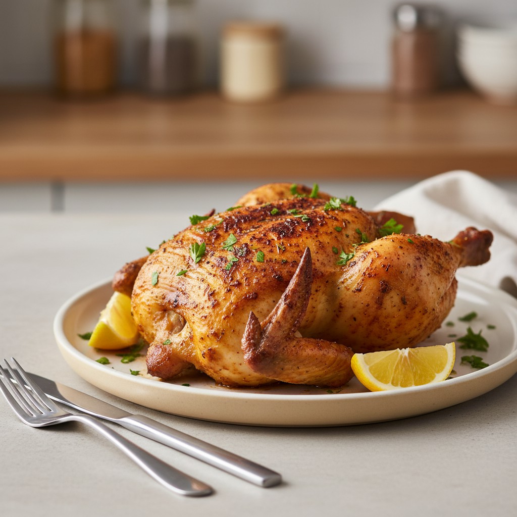 - Préchauffez le four à 210°C (chaleur tournante) ou préparez un barbecue à braises moyennes. Disposez le poulet à plat sur une grille au-dessus d’un plat pour recueillir le jus. Enfournez ou faites griller côté peau vers le haut pendant 40 à 50 minutes, en arrosant régulièrement avec le jus de cuisson. La peau doit être bien dorée et la chair juteuse (température à cœur : 75°C).