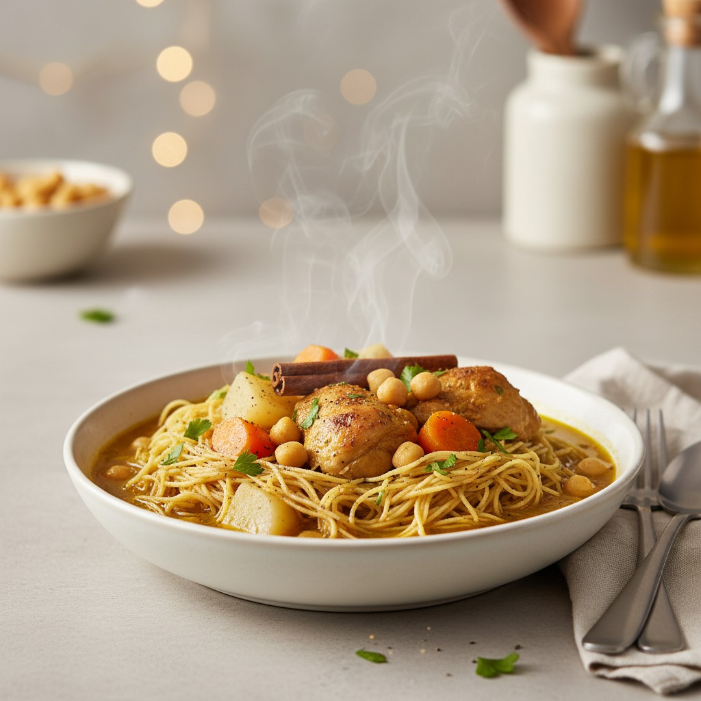 La rechta est un plat emblématique de la cuisine algéroise, composé de fines nouilles fraîches à la semoule, cuites à la vapeur puis nappées d’un bouillon parfumé au poulet, navets et pois chiches. Héritée de la tradition ottomane, la rechta est un incontournable des fêtes et des grandes occasions, appréciée pour sa légèreté, sa richesse aromatique et sa convivialité. Cette recette vous guide pas à pas pour réussir des pâtes maison authentiques, tout en proposant des astuces pour un bouillon savoureux et équilibré. Elle met l’accent sur la maîtrise de la cuisson vapeur et l’importance du choix des épices pour obtenir une rechta moelleuse, digeste et pleine de goût.