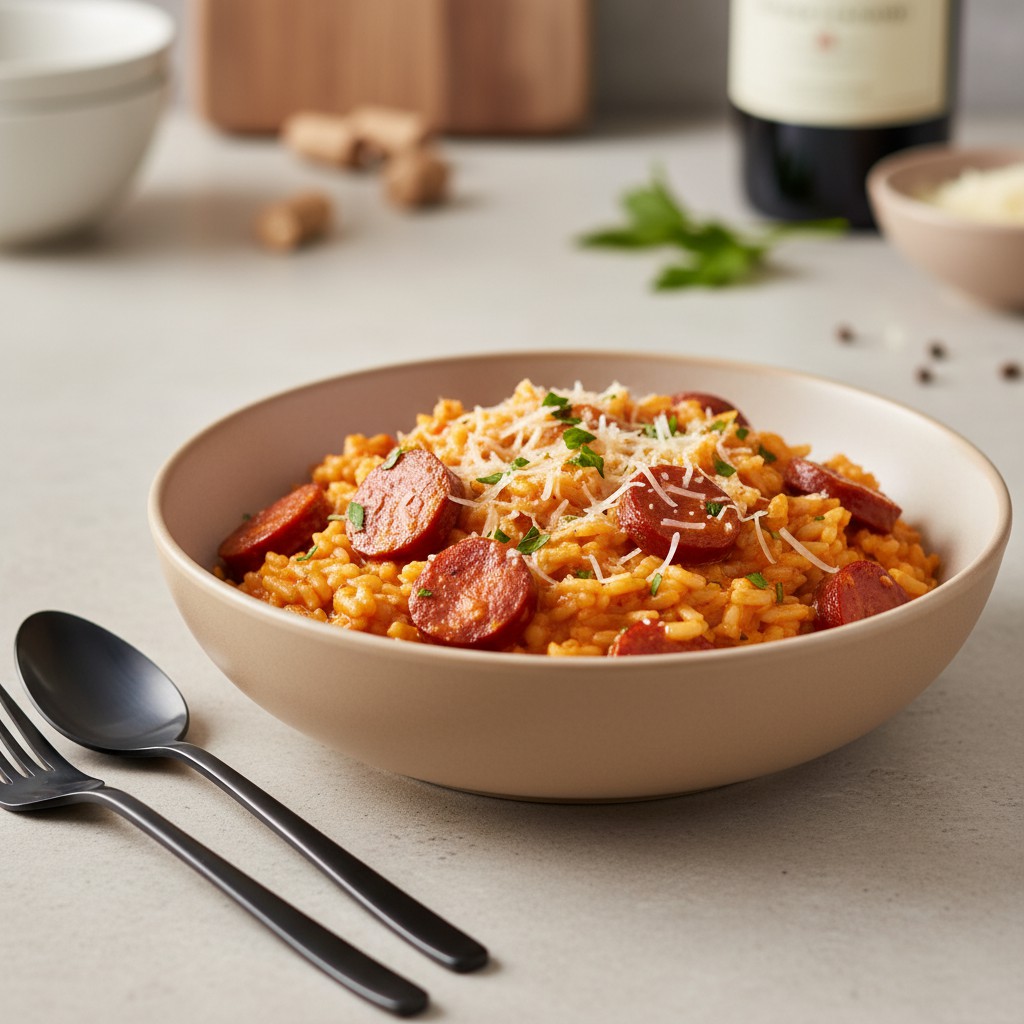 Ce risotto au chorizo, préparé au Cookeo, marie la douceur crémeuse du riz arborio à la puissance aromatique du chorizo. Cette recette, d’inspiration italienne revisitée avec une touche ibérique, offre un plat complet, savoureux et accessible, sans sacrifier la texture ni l’équilibre nutritionnel. Le Cookeo permet une cuisson maîtrisée et rapide, idéale pour réussir un risotto sans surveillance constante. Originaire du nord de l’Italie, le risotto est ici dynamisé par le chorizo, ingrédient phare de la cuisine espagnole, pour une alliance chaleureuse et conviviale.