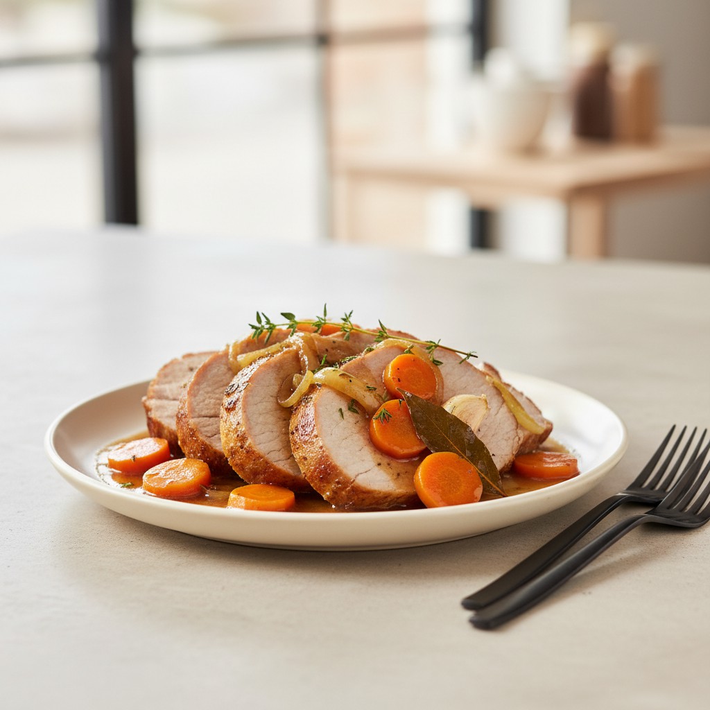 - Découpez le rôti en tranches épaisses pour préserver le moelleux. Servez avec les légumes et nappez de sauce. Accompagnez éventuellement de pommes de terre vapeur ou d’une purée maison pour un repas complet.