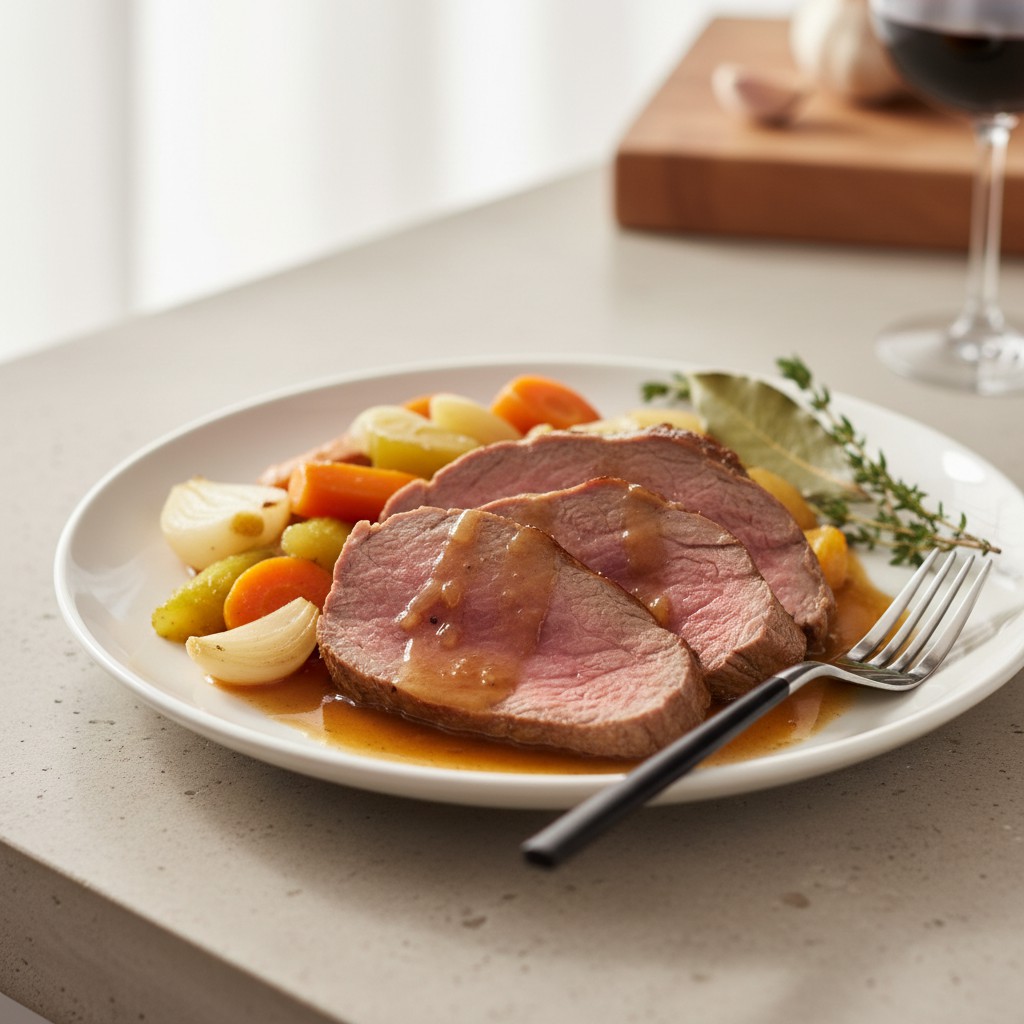 - Découper le rôti en tranches épaisses, servir avec les légumes fondants et napper de jus réduit. Accompagner de pommes de terre vapeur, de purée ou de légumes verts pour un repas équilibré.