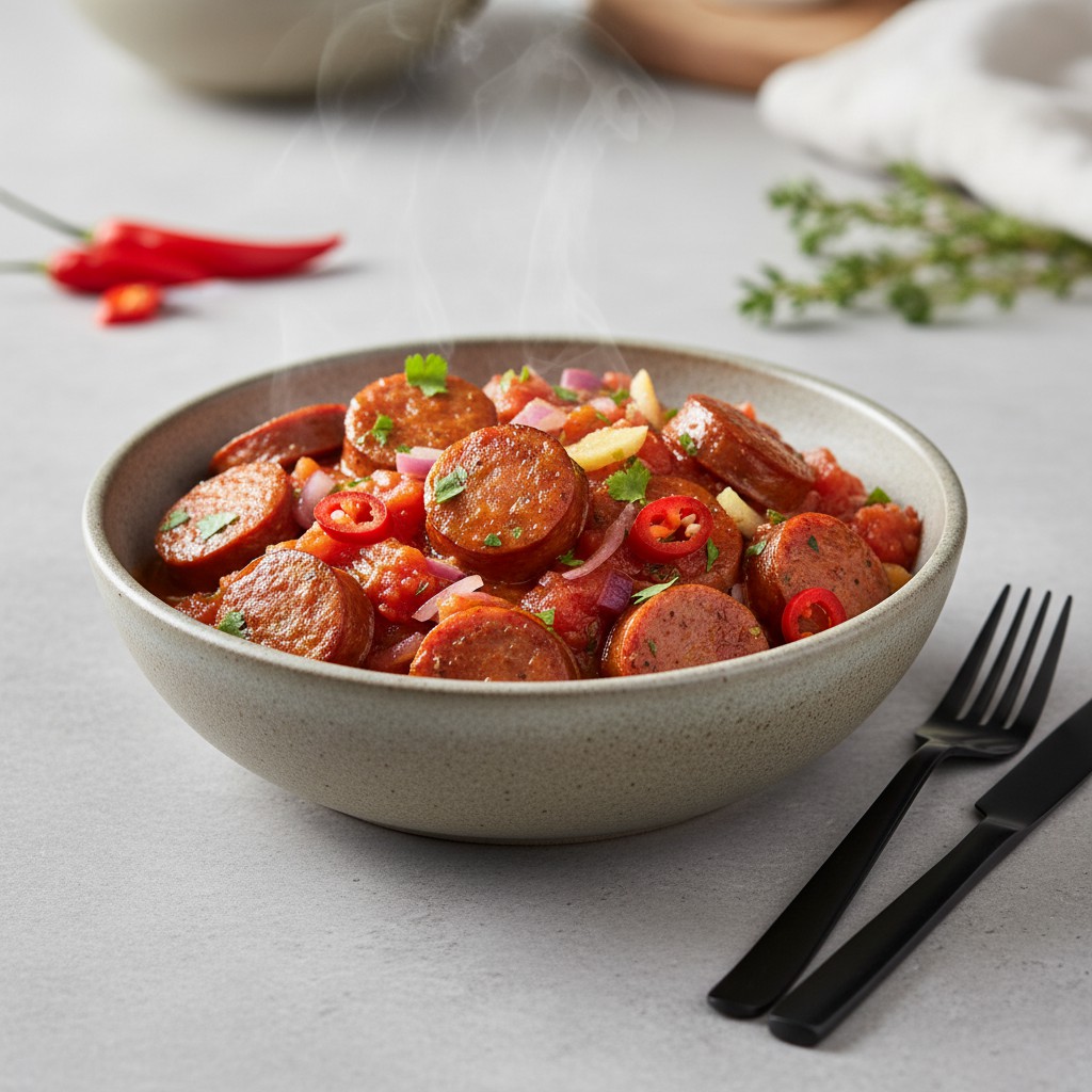 - 4. Ajoutez les saucisses blanchies (ou le poisson/tofu) et faites-les dorer 3 à 4 minutes. Cette étape développe les saveurs par la réaction de Maillard.