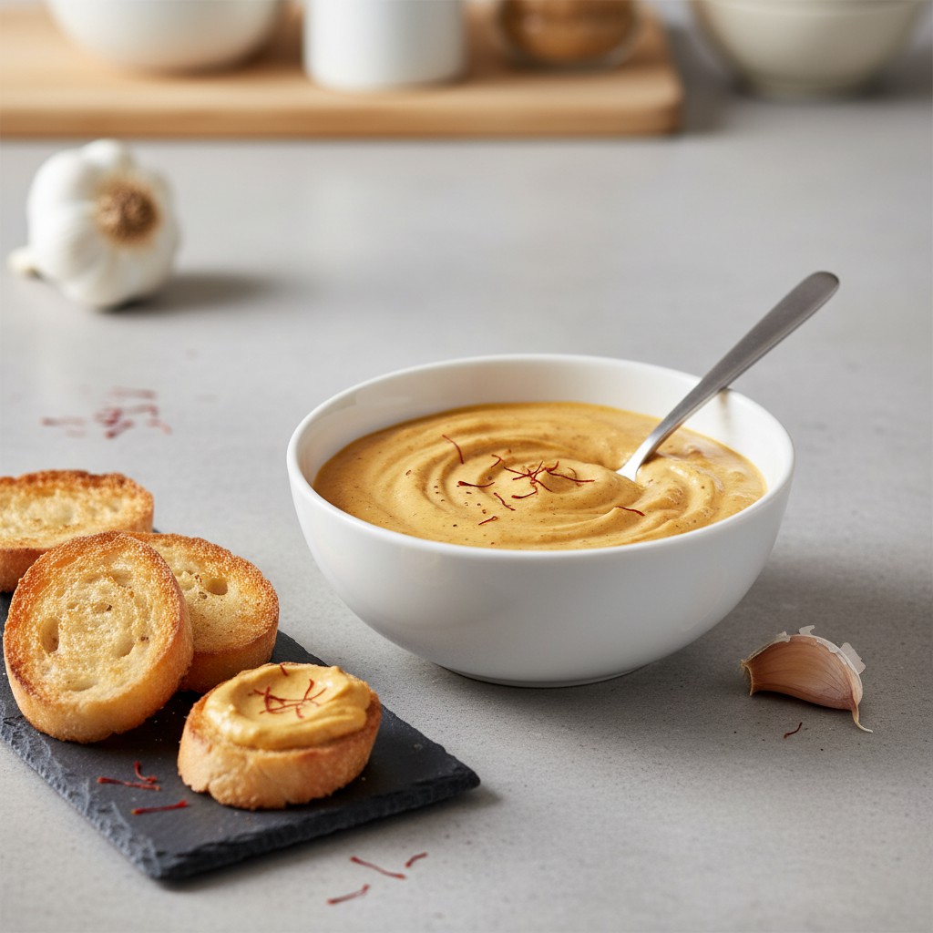 - Dans un bol, mélangez les jaunes d’œufs, la purée d’ail, la moutarde (si utilisée), le safran (ou curcuma), le piment, du sel et du poivre.