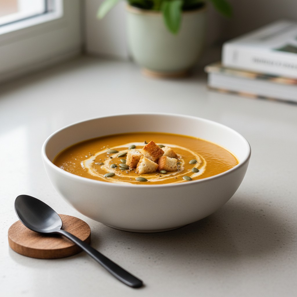 - Servir bien chaud, éventuellement avec une cuillerée de crème fraîche ou végétale, quelques graines de courge ou des croûtons pour le contraste de texture. Goûter et rectifier l’assaisonnement si besoin.
