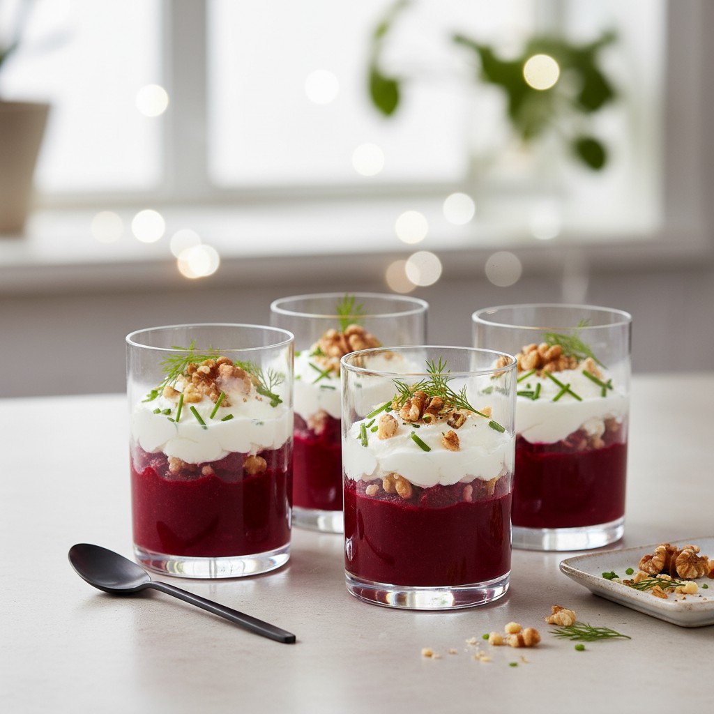 Cette verrine associe la douceur terreuse de la betterave à la fraîcheur du chèvre et au croquant des noix, pour une entrée élégante, équilibrée et rapide à préparer. Idéale pour un apéritif raffiné ou un début de repas léger, elle met en valeur des produits simples sans sacrifier la gourmandise. La betterave, légume racine emblématique d’Europe de l’Est et du bassin méditerranéen, est ici sublimée dans une préparation contemporaine, inspirée des tendances de la cuisine bistronomique française. L’association chèvre-betterave est un classique revisité, qui séduit par sa couleur vive, sa texture onctueuse et son équilibre nutritionnel (fibres, protéines, bons lipides).