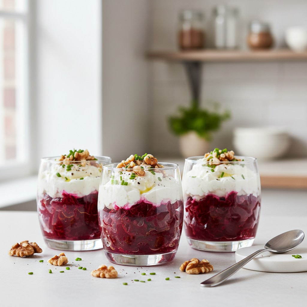 Cette verrine associe la douceur terreuse de la betterave à la fraîcheur du chèvre et au croquant des noix, pour une entrée élégante, équilibrée et rapide à préparer. Idéale pour un apéritif ou une mise en bouche raffinée, elle met en valeur des ingrédients simples et sains, tout en offrant une belle palette de textures et de couleurs. Originaire de la tendance contemporaine des verrines françaises, ce format individuel permet de soigner la présentation et de maîtriser les portions. L’association betterave-chèvre est un classique revisité ici pour maximiser le contraste des saveurs et la facilité d’exécution.
