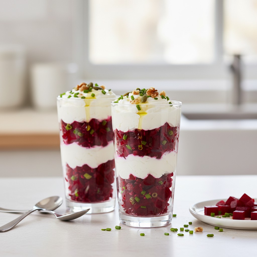 - Verrine préparée trop à l’avance : Montez les verrines au dernier moment pour préserver la fraîcheur et éviter que le fromage ne se colore avec la betterave.