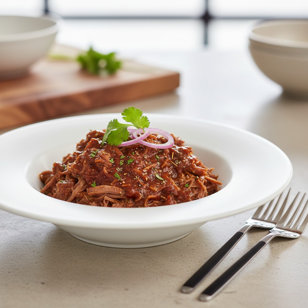 Le bœuf effiloché, ou « pulled beef », est une préparation lente et savoureuse où une pièce de bœuf mijote longuement jusqu’à devenir fondante, puis est effilochée à la fourchette. Originaire des cuisines américaines du Sud, ce plat est apprécié pour sa texture moelleuse, sa richesse aromatique et sa grande polyvalence : il se déguste aussi bien en sandwich, tacos, salades ou accompagné de légumes. Cette recette met l’accent sur la maîtrise de la cuisson lente, la juste assaisonnement et l’équilibre nutritionnel, tout en restant accessible à la cuisine maison. Elle valorise la simplicité des ingrédients, la patience et la technique pour obtenir un résultat authentique, sans compromis sur le goût ni la qualité.