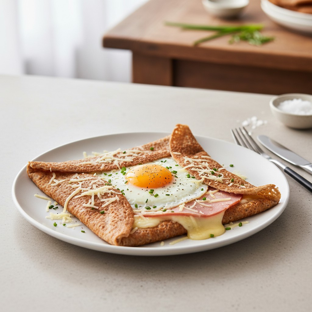 La galette de sarrasin, emblème de la Bretagne, est une crêpe salée fine et croustillante, réalisée à base de farine de sarrasin (blé noir), d’eau et de sel. Authentique, naturellement sans gluten, elle séduit par sa simplicité, sa saveur rustique et sa polyvalence : garnie d’œuf, de jambon, de fromage ou de légumes, elle s’adapte à tous les goûts. Cette recette, héritée des traditions paysannes, met en avant la maîtrise du geste et l’importance du repos de la pâte pour obtenir une texture parfaite. Accessible, économique et équilibrée, la galette de sarrasin est idéale pour un repas convivial, sain et rassasiant.