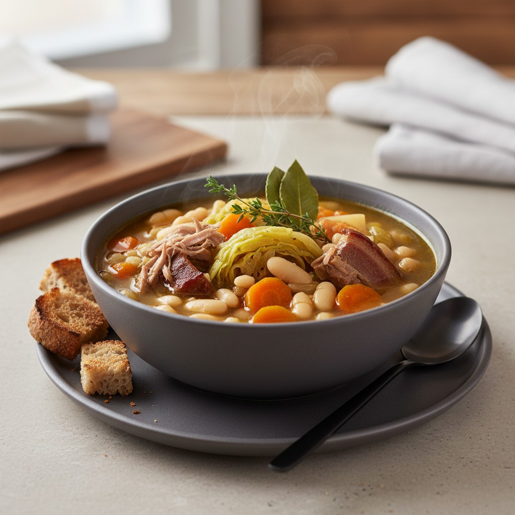 La garbure est une soupe paysanne emblématique du Sud-Ouest de la France, particulièrement du Béarn et de la Gascogne. Riche, nourrissante et conviviale, elle marie légumes de saison, haricots blancs et morceaux de viande confite (souvent du canard ou du porc). Ce plat rustique, autrefois plat principal des bergers, se distingue par sa générosité, sa profondeur de goût et sa capacité à réchauffer les corps comme les cœurs. La garbure est un modèle d’équilibre nutritionnel : fibres, protéines, micronutriments et une belle satiété. Sa préparation demande du temps mais peu de technicité, et chaque étape a son importance pour obtenir une texture fondante et un bouillon parfumé. C’est aussi une recette idéale pour apprendre à gérer la cuisson des légumes et des légumineuses, et à valoriser les restes.
