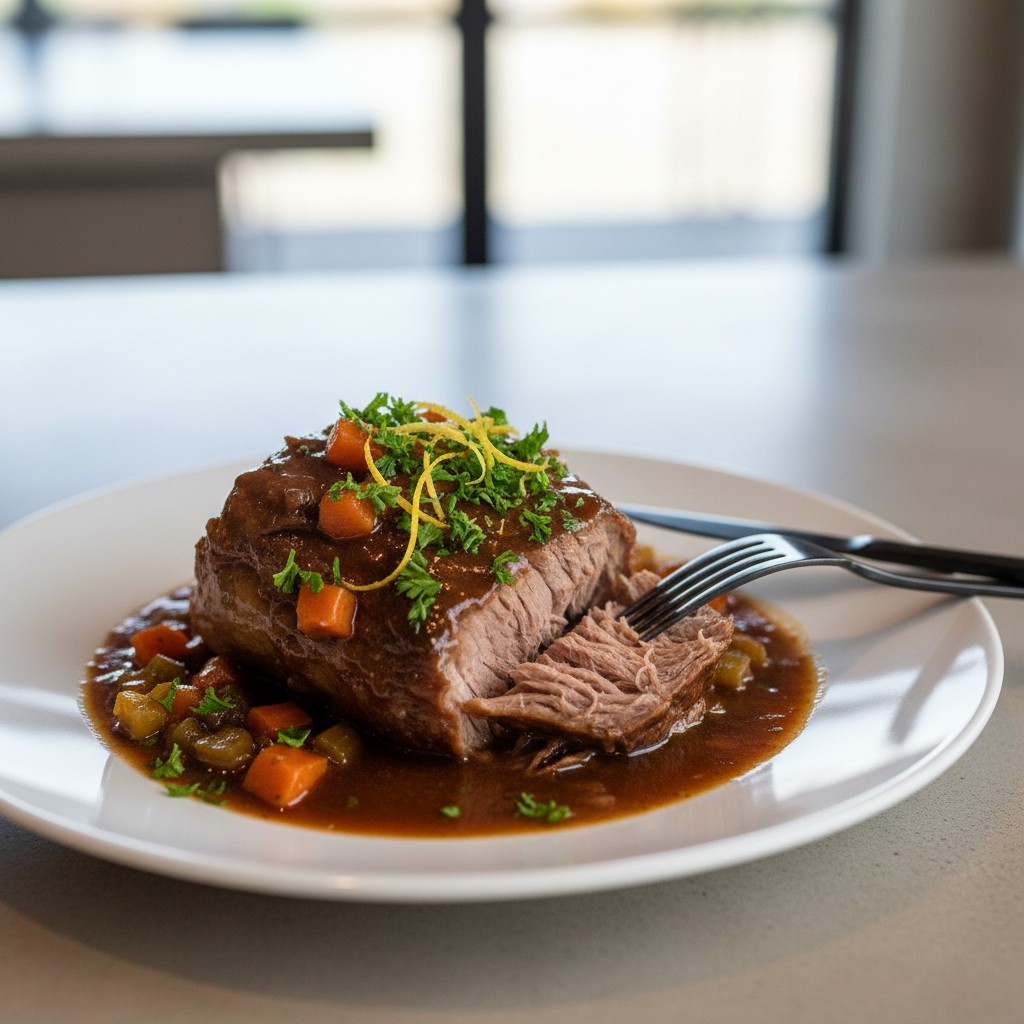- Retirez le bouquet garni. Rectifiez l’assaisonnement. Pour une sauce plus liée, écrasez quelques légumes dans le jus ou faites réduire à découvert quelques minutes. Servez le jarret nappé de sauce, parsemez de persil frais et d’un zeste de citron pour la fraîcheur.