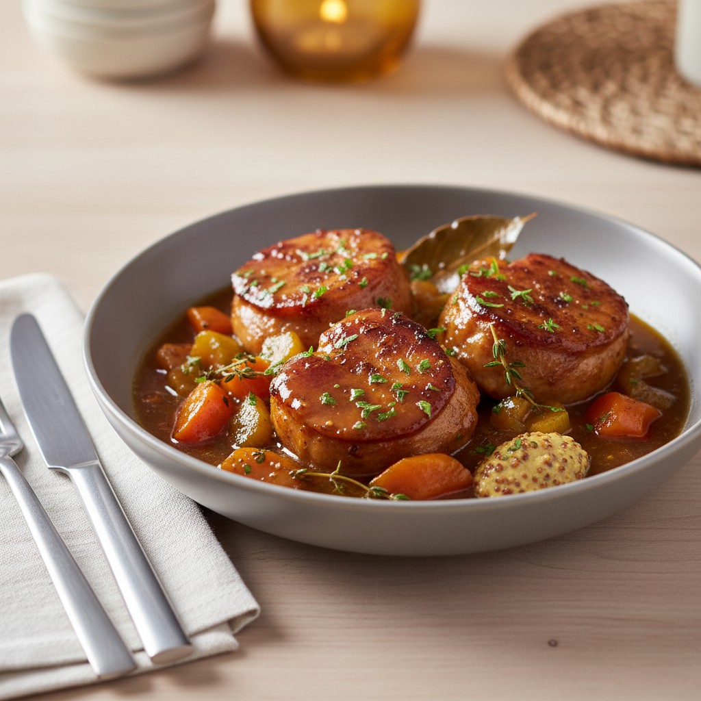 - Finition : retirer le thym et le laurier. Si la sauce est trop liquide, la faire réduire à découvert quelques minutes à feu moyen. Rectifier l’assaisonnement. Pour une touche gourmande, incorporer la moutarde à l’ancienne hors du feu.