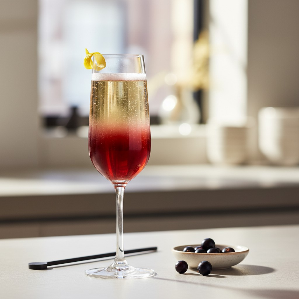 - Ne remuez pas : le champagne va naturellement se mêler à la crème de cassis, créant un dégradé élégant. Mélanger brutalement ferait s’échapper les bulles et troublerait la présentation.