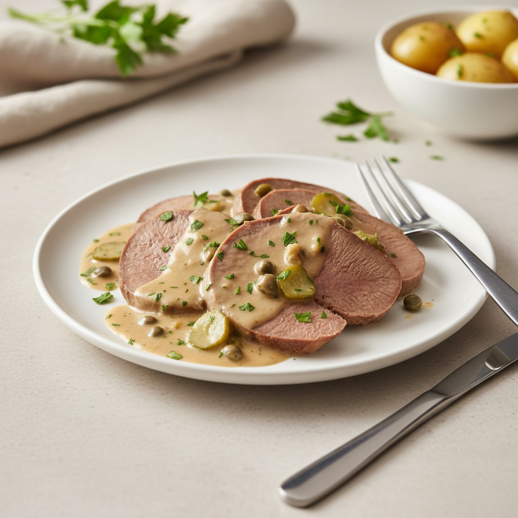 - 5. Préparer la sauce : Dans une casserole, faire fondre le beurre, ajouter la farine et cuire 2 minutes en remuant (réaliser un roux blond). Ajouter progressivement une louche de bouillon chaud en fouettant pour obtenir une sauce lisse et nappante. Ajouter les cornichons émincés, les câpres, la moutarde et le persil. Rectifier l’assaisonnement.