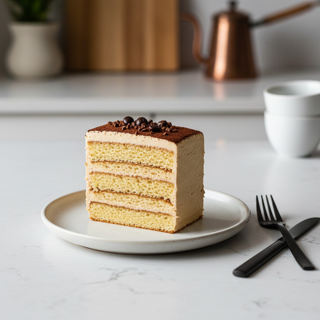 - Saupoudrez de cacao en poudre à l’aide d’une passoire fine. Décorez avec des grains de café en chocolat ou des éclats de café torréfié. Réservez au frais au moins 2 heures avant de découper pour que les saveurs se diffusent et la crème se raffermisse.