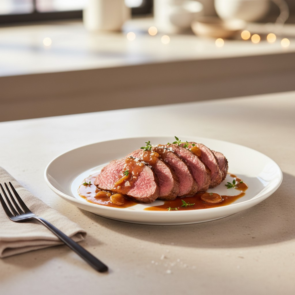 - Transférer la poêle (ou déposer la viande dans un plat) au four. Cuire 20 à 25 minutes pour une cuisson rosée (à cœur : 60-62°C), ou 30 à 35 minutes pour une viande plus cuite. Retourner à mi-cuisson et arroser régulièrement avec le jus.