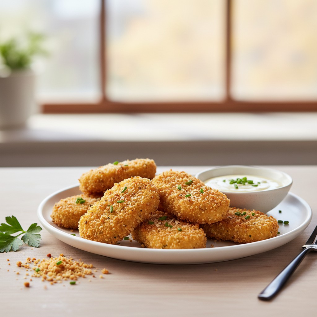 - Pour la cuisson au four (option plus légère) : préchauffez le four à 200°C. Déposez les nuggets sur une plaque recouverte de papier cuisson, vaporisez ou badigeonnez légèrement d’huile. Enfournez 15 à 18 minutes en retournant à mi-cuisson, jusqu’à ce qu’ils soient dorés.