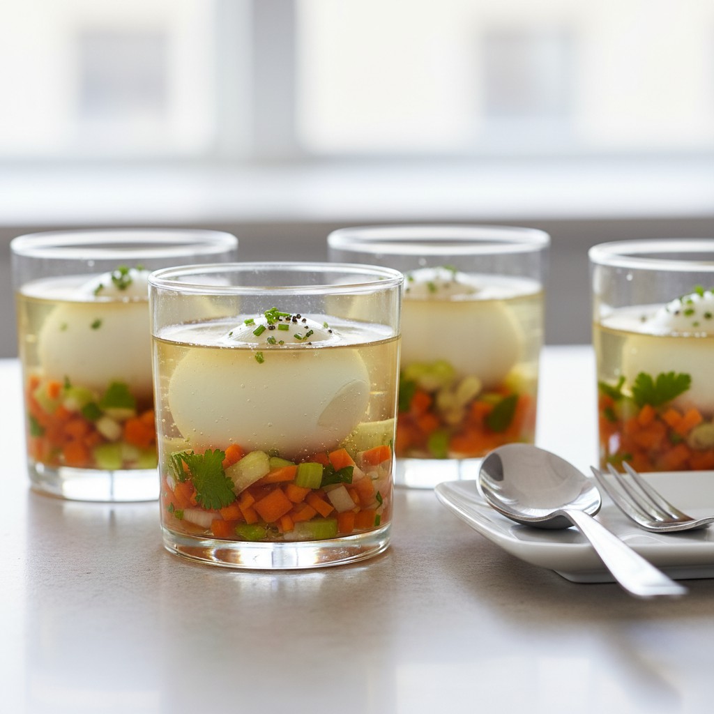 L’œuf en gelée est une entrée classique de la cuisine française, appréciée pour sa fraîcheur, sa légèreté et son élégance. Cette recette marie la douceur d’un œuf mollet à la délicatesse d’une gelée parfumée au bouillon, souvent agrémentée de fines herbes ou de petits légumes. Héritée des buffets traditionnels et des tables bourgeoises, elle met en valeur la maîtrise des textures et la précision des cuissons. Accessible mais exigeante sur la technique, elle offre un équilibre nutritionnel intéressant : protéines de l’œuf, peu de matières grasses, et possibilité d’ajouter des légumes pour plus de fibres. Idéale pour une entrée raffinée, elle se prépare à l’avance et se déguste bien fraîche.