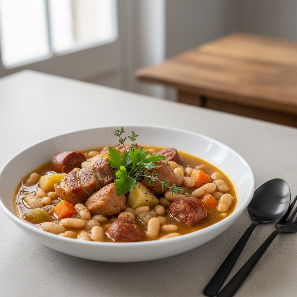 - 7. Au bout de 2 heures, ajoutez les saucisses de Toulouse entières et, si vous le souhaitez, les pommes de terre coupées en gros morceaux. Poursuivez la cuisson 30 à 40 minutes, jusqu’à ce que les haricots soient fondants et la viande très tendre.