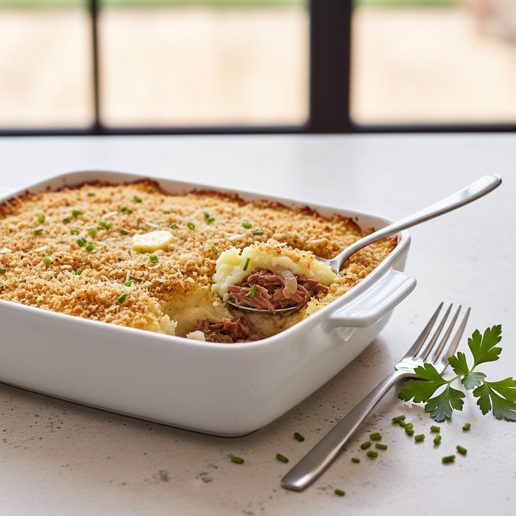 - Dans un plat à gratin, répartissez uniformément la préparation au canard. Recouvrez délicatement avec la purée de pommes de terre, lissez la surface à la spatule. Pour une croûte dorée, saupoudrez de chapelure et ajoutez quelques noisettes de beurre.
