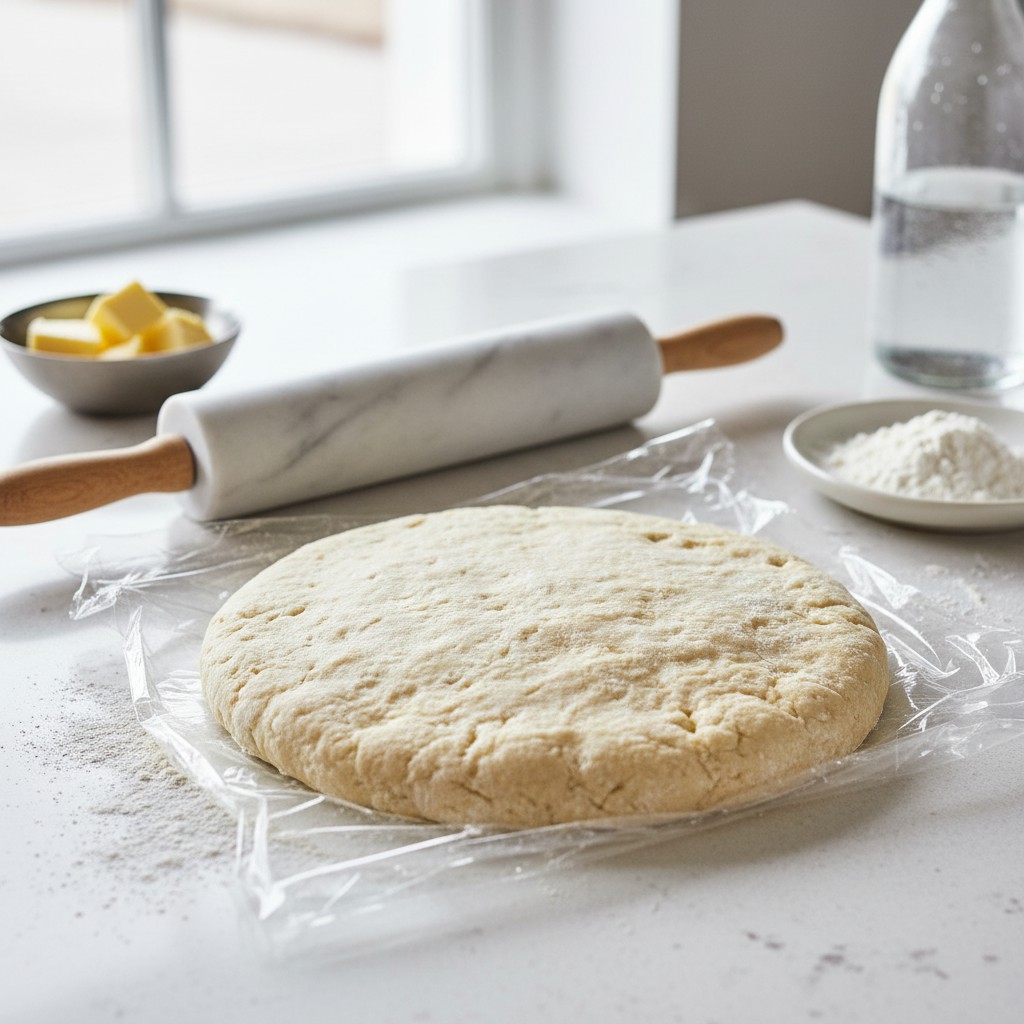 - Formez un disque plat, enveloppez-le dans un film alimentaire. Laissez reposer au réfrigérateur au moins 30 minutes (jusqu’à 2 heures). Ce repos détend le gluten et facilite l’étalage.