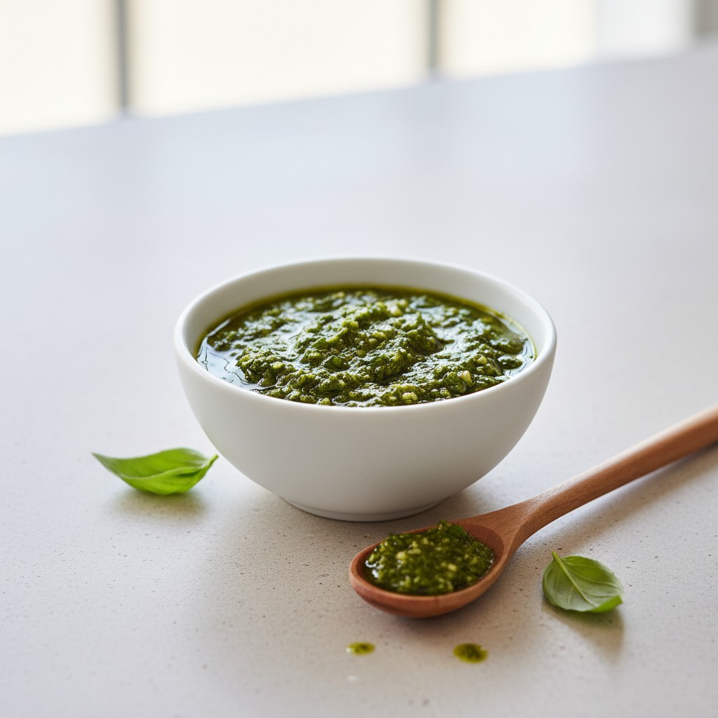- Goût amer : Utilisez uniquement les feuilles de basilic, sans tiges, et choisissez une huile d’olive douce.